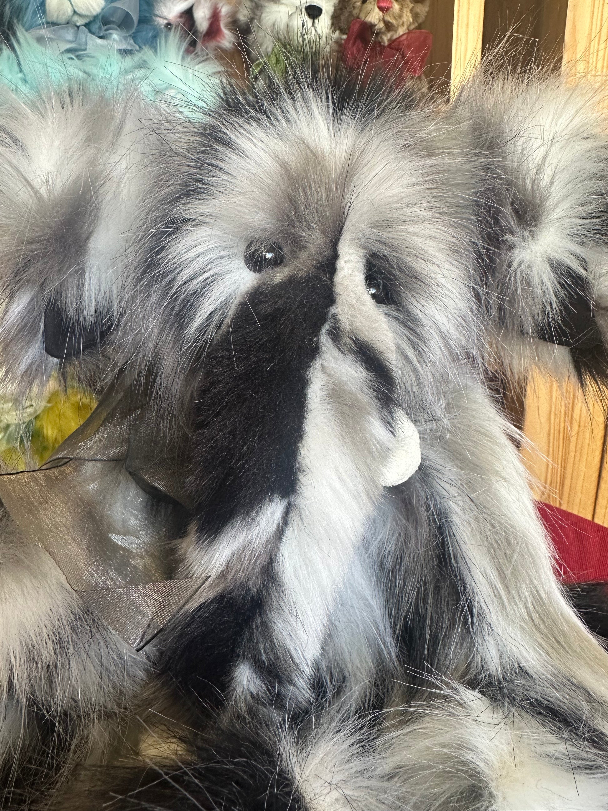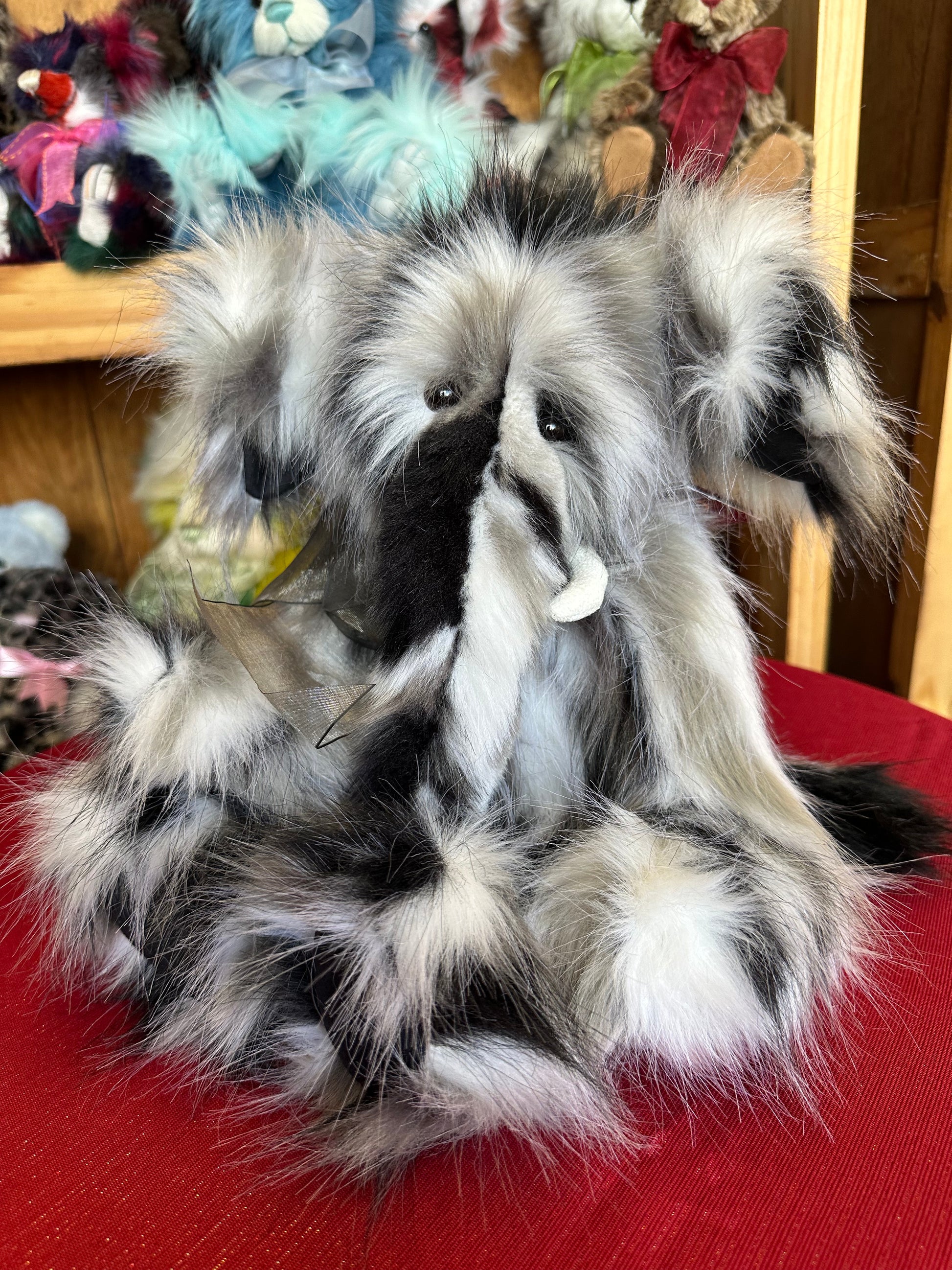 Everest is a fun plush elephant friend from the 2024 Charlie Bear plush collection. He has gray, black and white fur that is long and soft. He is also wearing a gray ribbon bow around his neck to show how stylish he is. This 16" fully-jointed friend would make a fun addition to any home!