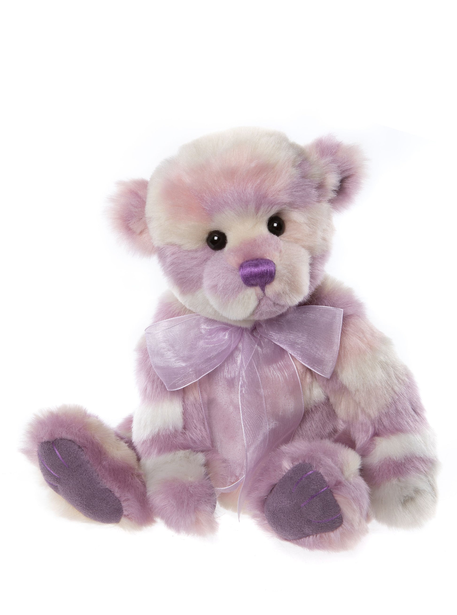 Hollyhock is a soft bear from the 2024 Charlie Bear Labyrinth Collection. She has a unique lilac and cream pattern and is wearing a light pink bow. This 12.5" friend is fully-jointed and excited to meet her new family!