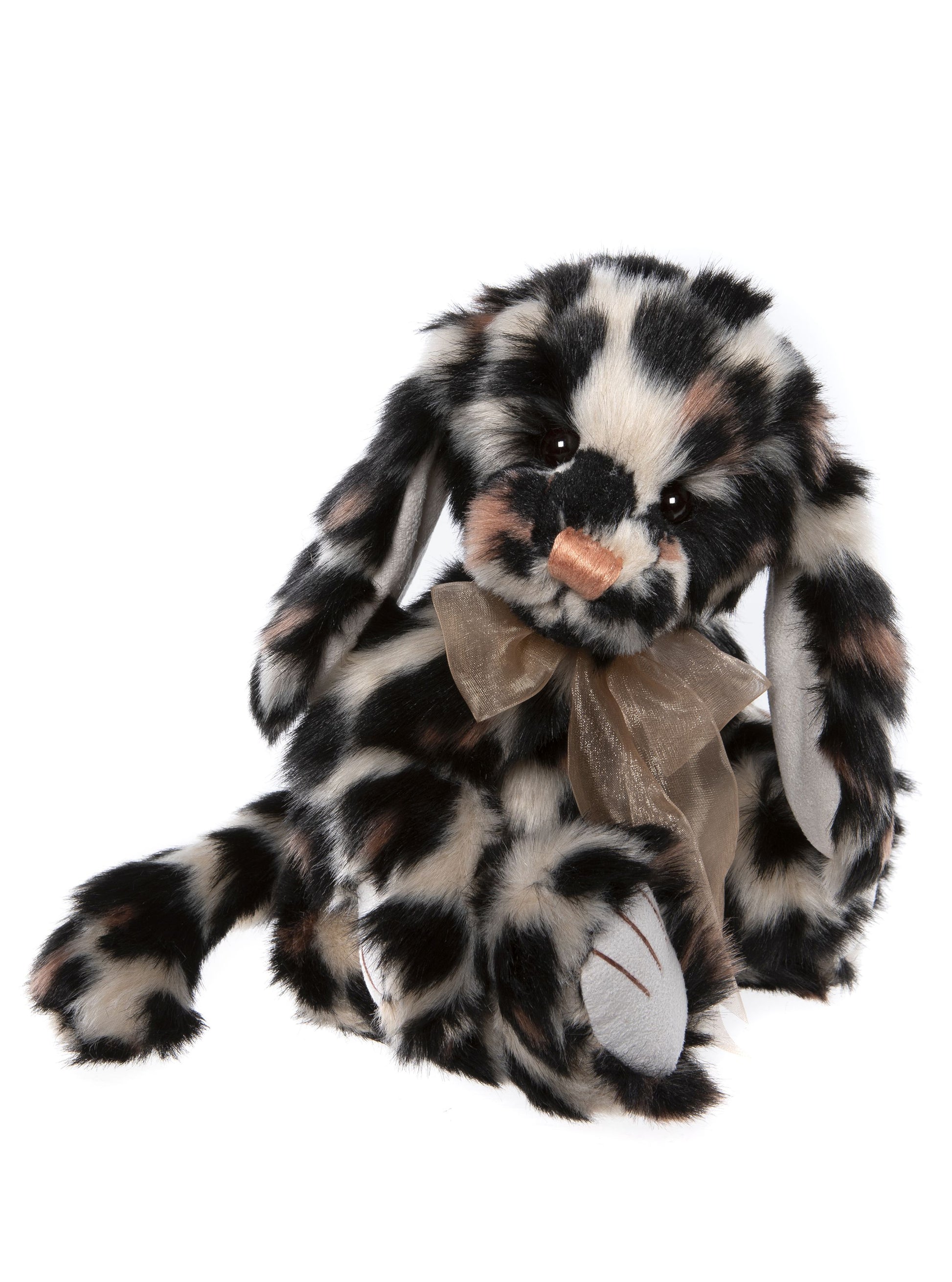 Mollie is a puppy with fun patterned fur from the 2024 Charlie Bear plush collection. This friend is fully jointed with long floppy ears and is wearing a tan bow that complements her fur color.