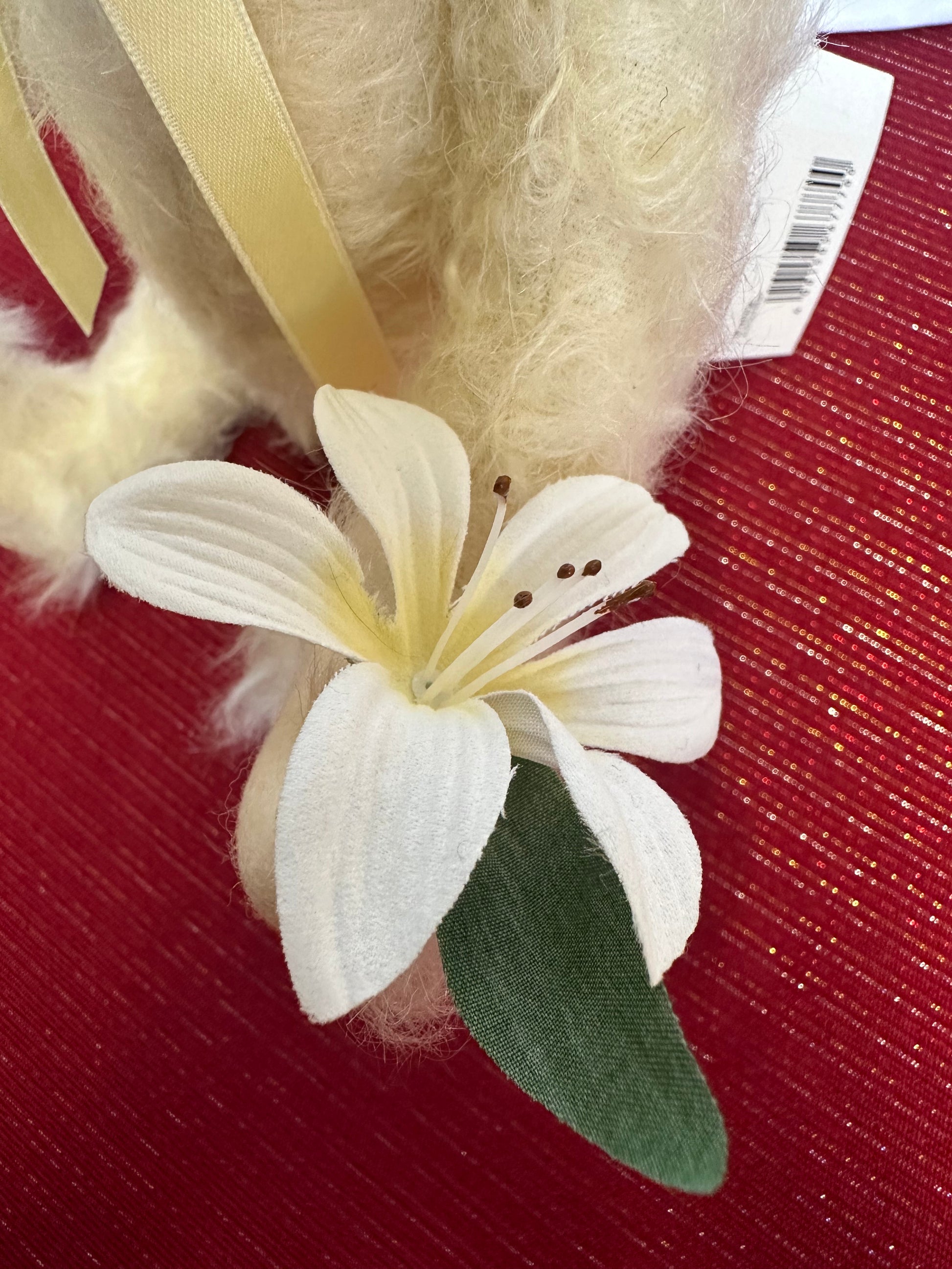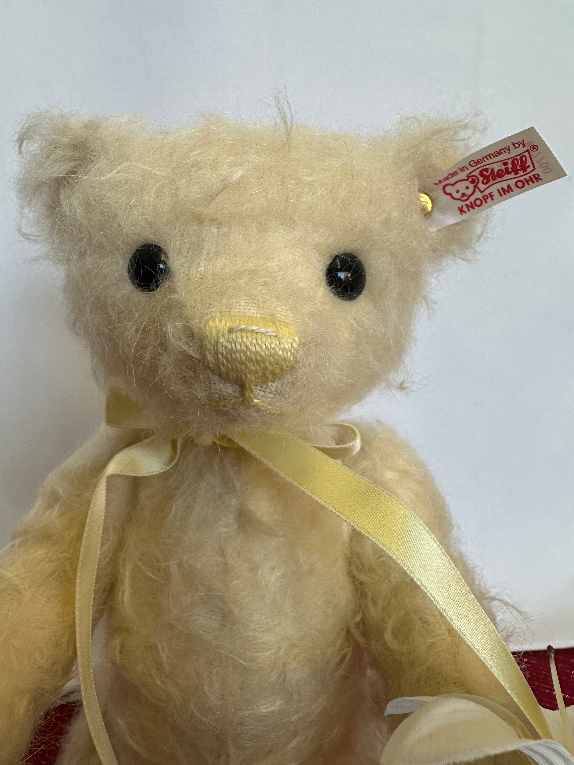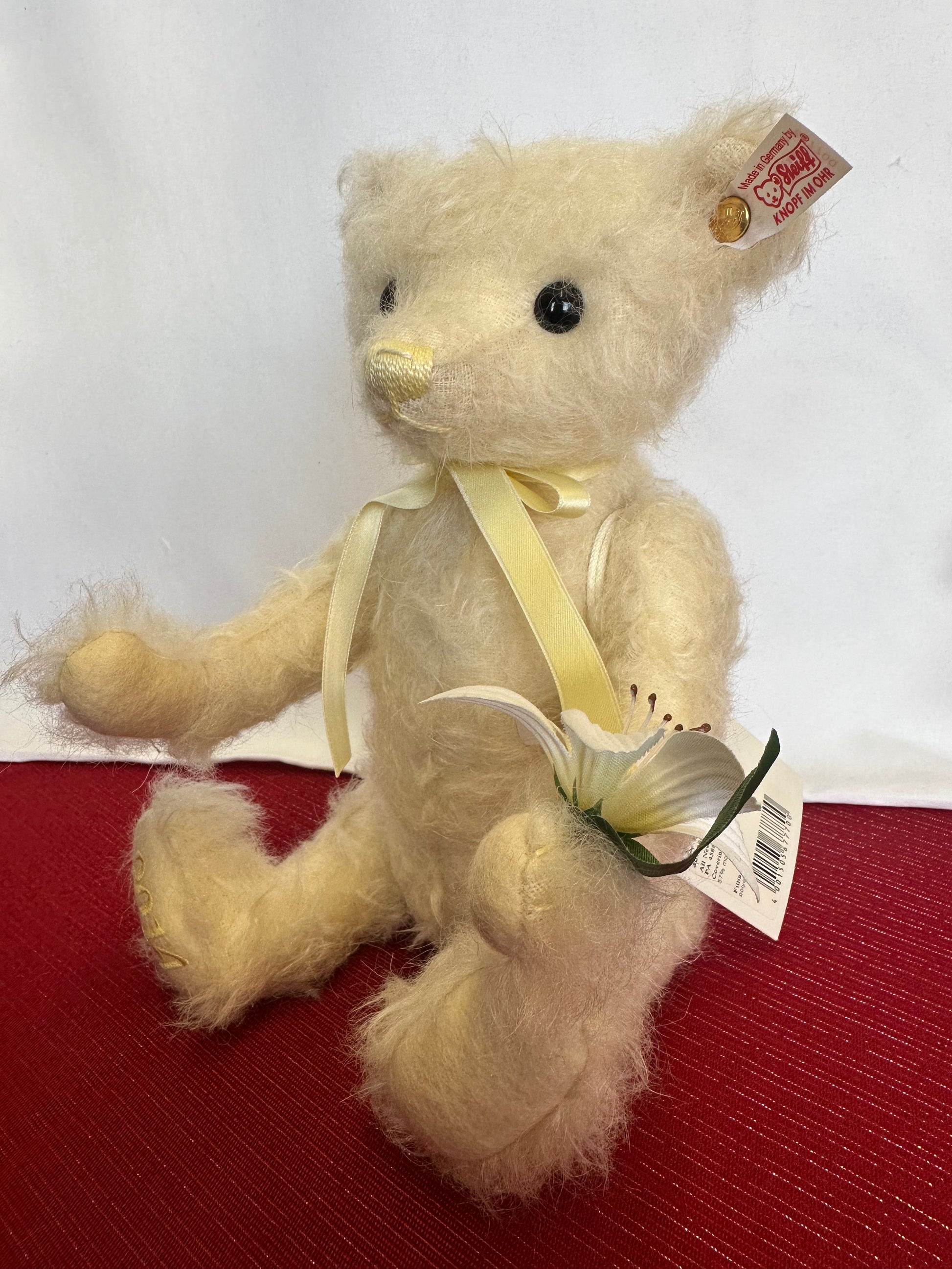 This beautiful teddy bear is holding a lily blossom and is wearing a light yellow bow that complements her soft fur. She is 11.2" and is fully jointed. She was released as part of the 2014 Steiff Collection and limited to 1,500 pieces. She comes complete with her box and certificate of authenticity.